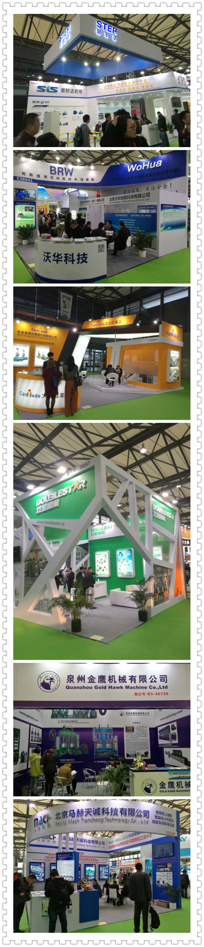 本次展會(huì )共分四個(gè)館進(jìn)行展覽。E1館以第十屆亞洲埃森輪胎展主打,為觀(guān)眾帶來(lái)了中國輪胎制造業(yè)的展示盛宴,中策橡膠集團,雙錢(qián)輪胎,三角輪胎,貴州輪胎,中化橡膠,恒豐橡塑,銀寶集團,盛泰集團,天津國際聯(lián)合輪胎等當今國內諸多制造商聯(lián)合打造,實(shí)力綻放。同期由中國輪胎循環(huán)利用協(xié)會(huì )主辦的中國國際輪胎資源循環(huán)利用展覽的加盟使得整體展會(huì )涉及領(lǐng)域增加輪胎翻新,再生橡膠,橡膠粉,廢輪胎熱裂解4項,完成橡膠行業(yè)制品從生產(chǎn)到循環(huán)利用全產(chǎn)業(yè)鏈閉環(huán)。E2館為橡膠機械行業(yè),橡膠助劑行業(yè)集中展示區域,軟控股份,VMI,特洛埃斯特,賽象科技,大橡塑,中化桂林,萬(wàn)向新元,等世界橡機36強企業(yè)領(lǐng)銜展現。橡膠化學(xué)品行業(yè):江蘇圣奧,尚舜化工,科邁化工,蔚林化工,陽(yáng)谷華泰,斯遞爾化工,雙力化工巨頭云集。